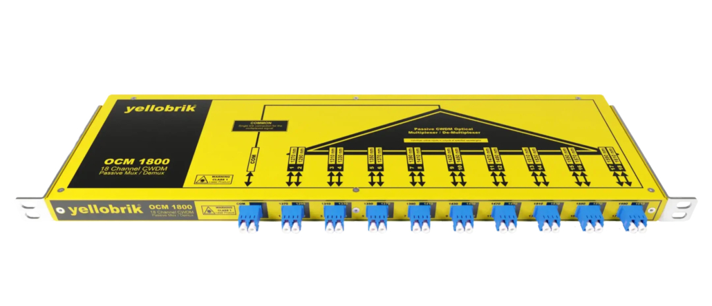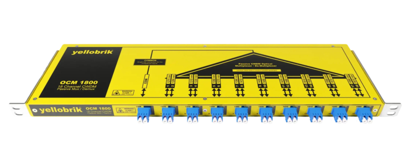 Le Yellobrik OCM 1800 permet de transmettre ou de recevoir jusqu’à 18 signaux via une seule liaison fibre. Il utilise le multiplexage CWDM pour combiner plusieurs signaux sur une même fibre, puis les séparer à l’autre extrémité, optimisant ainsi l’utilisation des infrastructures existantes. L’OCM 1800 se présente sous la forme d’un multiplexeur/démultiplexeur tout-en-un, offrant de meilleures performances en termes de puissance de signal par rapport à des configurations en cascade utilisant les modèles OCM 1841/42/43/44 et OCM 1891/92.