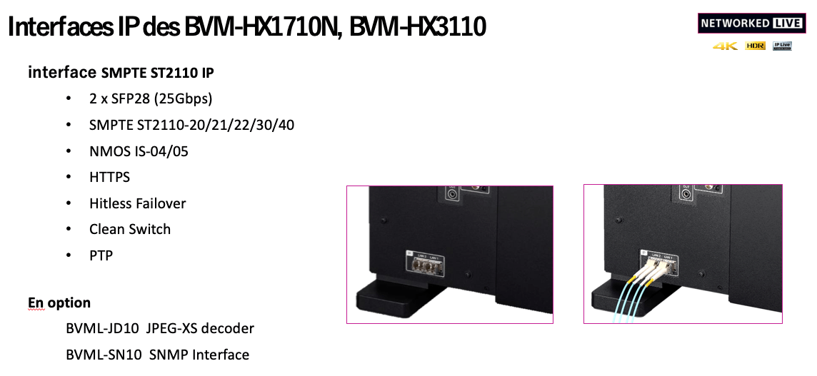 Sur la version N, on retrouvera deux interfaces IP (ST2110) SFP28 (25 Gbit/s). La dalle LCD est bien sûr signée 100 % Sony. Elle bénéficie d’une gestion fine de la stabilité thermique, laquelle garantit une reproduction fidèle et constante des couleurs. Une qualité essentielle pour les usages critiques tels que l’étalonnage ou le contrôle qualité. Côté valeurs, elle affiche une luminance typique de 3000 cd/m² pouvant atteindre jusqu’à 4000 cd/m² en mode spécifique, ainsi qu’un contraste supérieur à 3 000 000:1 pour une résolution 4K UHD (3840 x 2160).