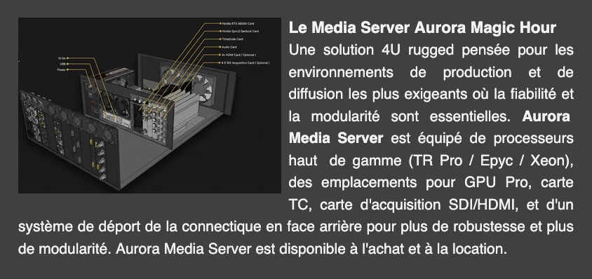 Si la gamme Aurora regroupe l’ensemble des solutions serveur, des machines simples aux architectures multinœuds ou multi GPU, les fermes de rendu y trouvent naturellement leur place. « Une ferme de rendu, au fond, c’est juste du serveur, rappelle Marc Jourdan. On multiplie les processeurs ou les cartes graphiques pour augmenter la puissance de calcul, mais on reste sur une logique de serveur traditionnel. Quant aux serveurs de médias, nous avons pris le parti de les équiper d’une interface de connecteurs professionnels déportés, très utile lorsque ceux-ci sont amenés à passer d’une production à une autre. En cas de casse, on change l’interface très rapidement ; la connectique des cartes est ainsi préservée. »