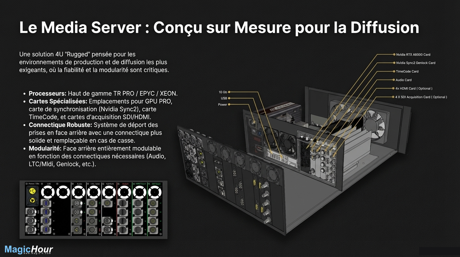 Pour chaque gamme, chaque config fait l’objet de tests validés en atelier pour garantir un usage clé en main sans surprise de compatibilité. Une exigence « primordiale notamment avec les stations de travail, du montage à l’étalonnage, jusqu’à l’animation 3D et les VFX », insiste Marc Jourdan. Et ce avec les softs que distribue Magic Hour comme DaVinci Resolve/Fusion ou Aximmetry pour les studios virtuels, mais aussi « avec tous les éditeurs du marché ».