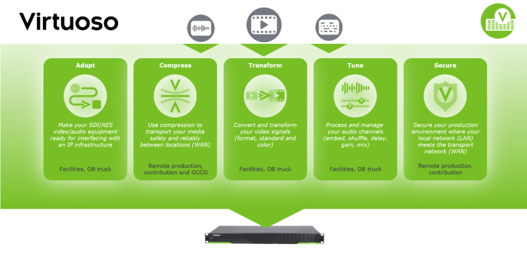 À Las Vegas, Sony montrera son écosystème Networked Live ! Parmi ses composants, on pense notamment à Virtuoso de Nevion chargé du transport, du traitement et du monitoring des signaux en temps réel. Sur son versant audio, l’une de ses fonctionnalités baptisée Tune propose le traitement audio, du routage au contrôle des canaux (phase, gain, délai, mix). Afin de pallier les limitations physiques des interfaces audio pour les entrées et sorties non-IP, Nevion lance Virtuoso SoniX.